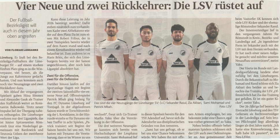 Die treuen Fußballfans der Lüneburger SV kommen nicht zu kurz. Insgesamt 58 Spiele, davon 34 Partien der 1. Herrenmannschaft in der inzwischen vierten Bezirksliga-Saison und 24 Begegnungen des 2. Herrenteams (2. Kreisklasse Nord), können die Anhänger des knapp 500 g schweren runden Leders, ob auswärts oder vor heimischer Kulisse, vollends in der Saison 2025 / 2026 genießen. (jb)